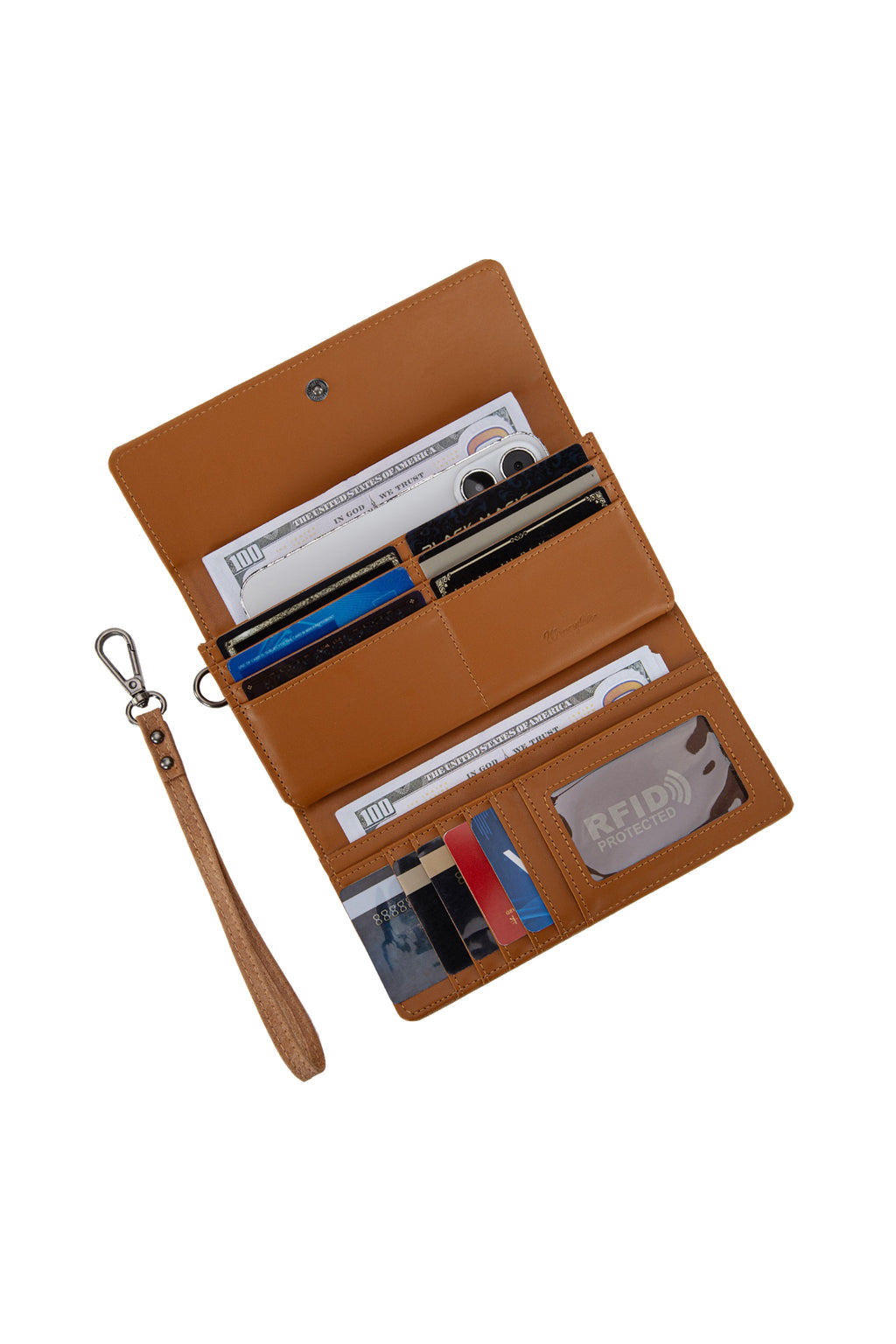 - Detachable wristlet strap for clutch-style carrying
